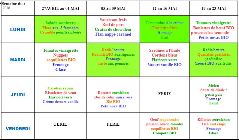 Menus Cantine : Mai 2026